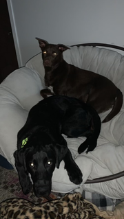 Oliver absolutely loves cuddles and scratches. He loves to go for walks (mainly to chase leaves), play outside, wrestle with his brother, chase my nephews, play with other dogs, and go for car rides and have the wind blow up his ears and mouth flaps. He is very food motivated, so whenever we're cooking, he is right there waiting for his opportunity to catch the scraps to make sure it's safe for us to eat. :)